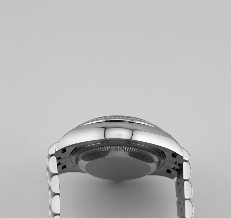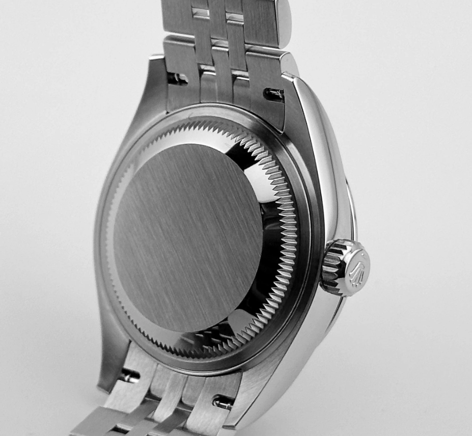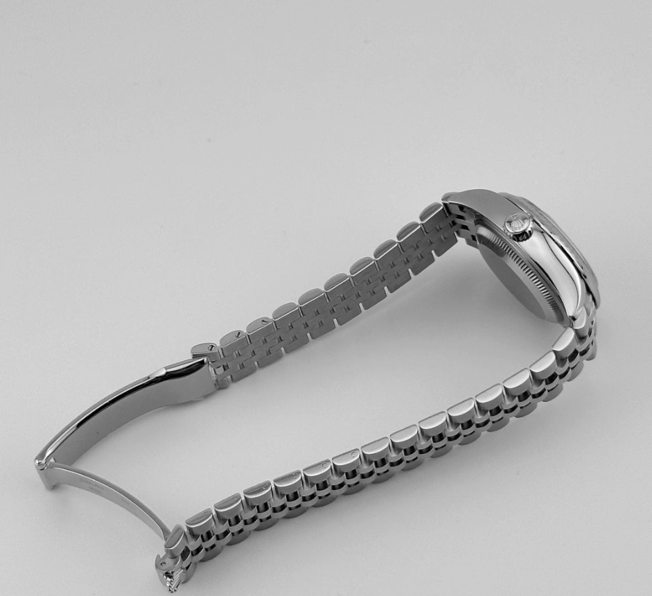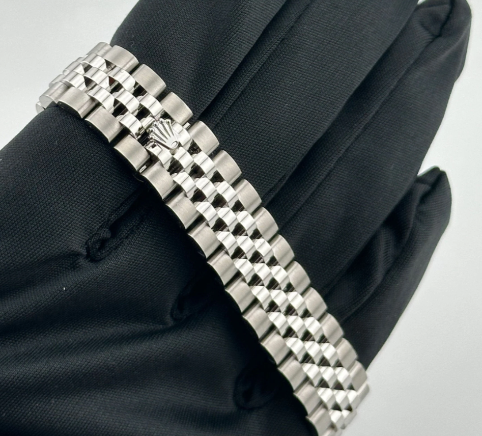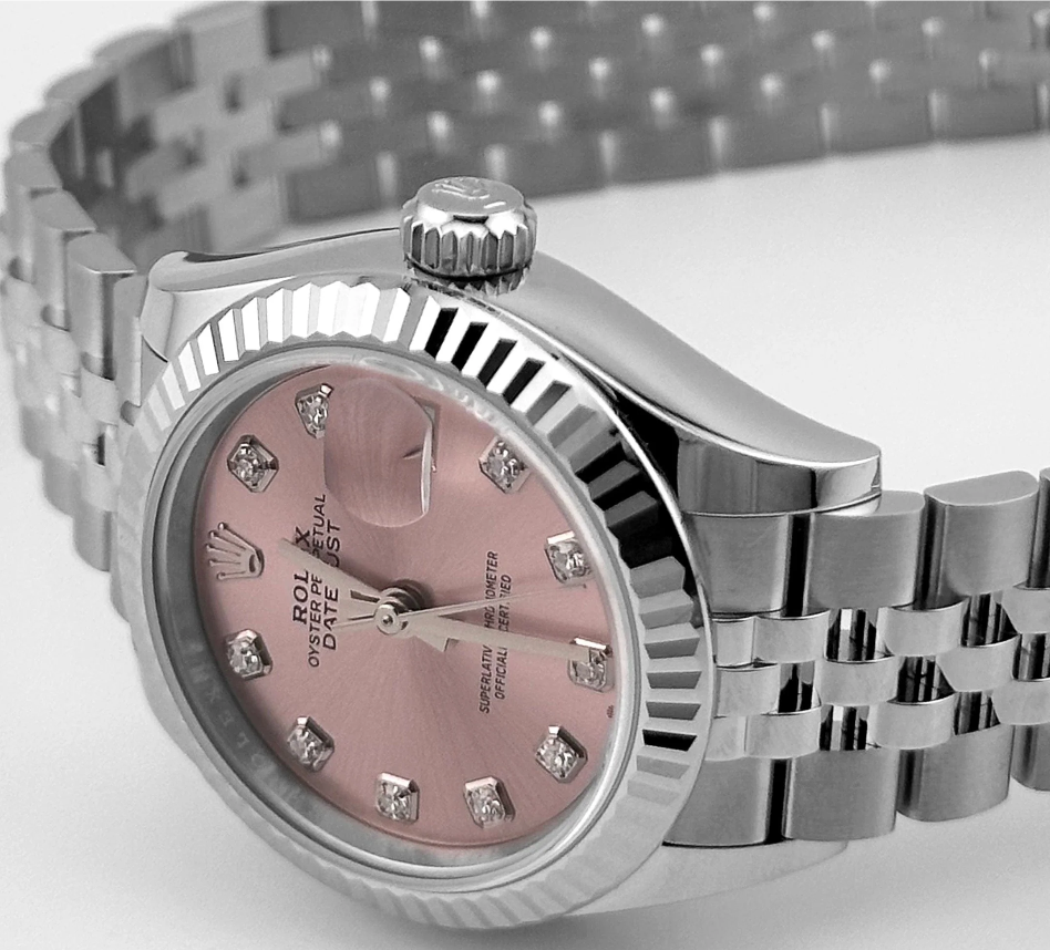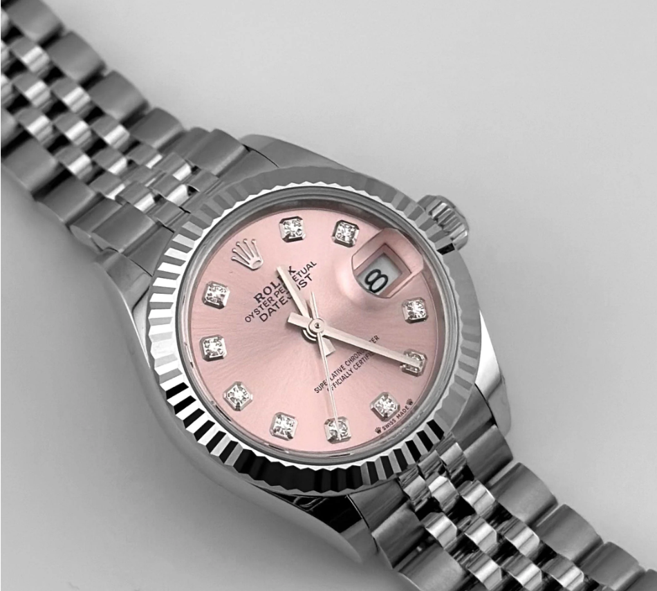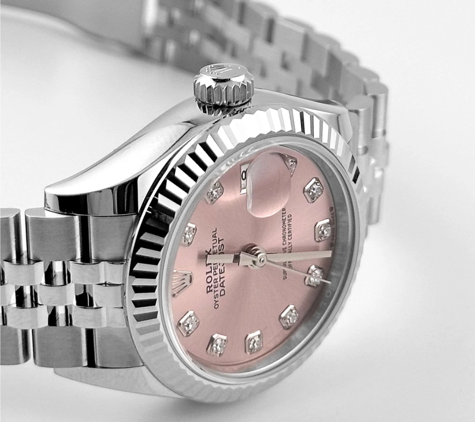 The Rolex Datejust 28 delivers understated refinement in a compact, elegant form. Its 28 mm stainless steel case is paired with a white gold fluted bezel that frames a soft pink dial—enriched with 10 brilliant-cut diamond hour markers for a delicate sparkle. The date window at 3 o’clock retains Rolex’s signature cyclops magnification, integrating utility within a poised layout.