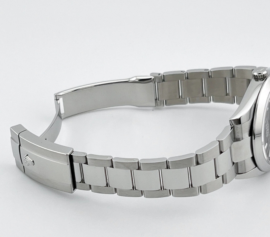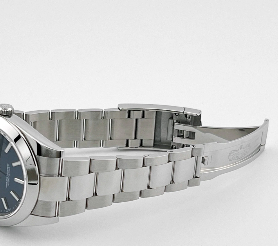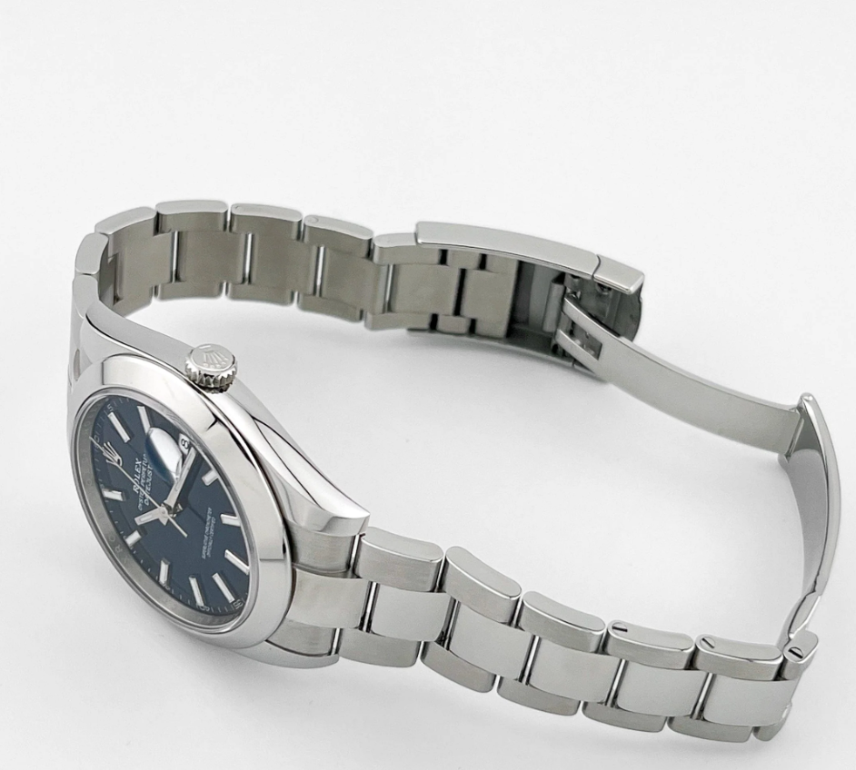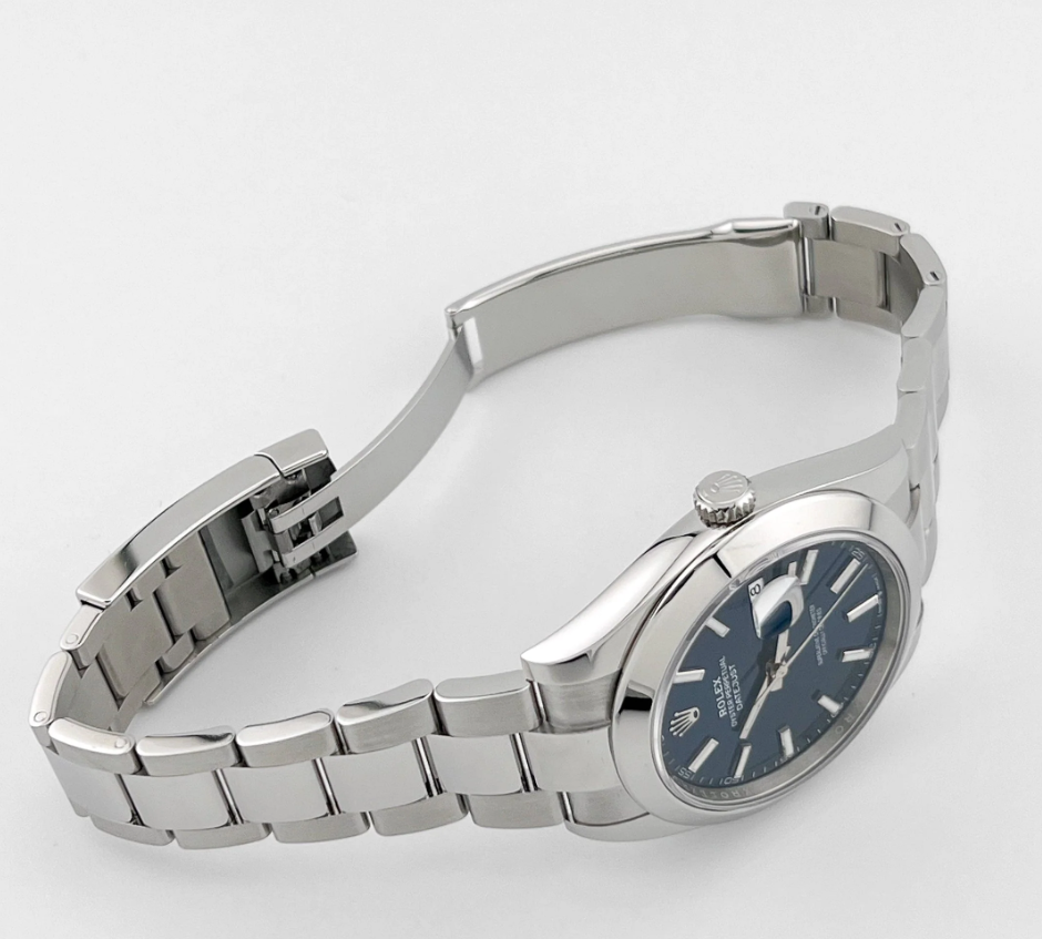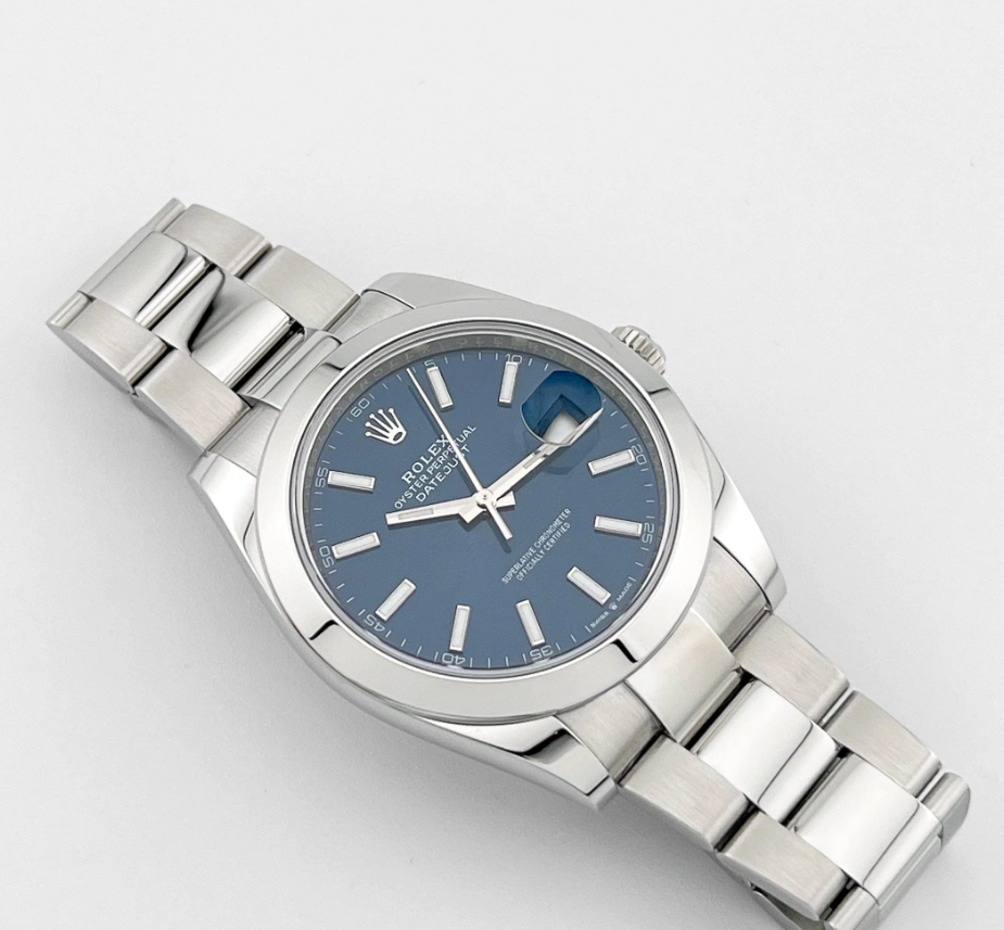 The Rolex Datejust is a refined and versatile timepiece, crafted in stainless steel with a sleek 41mm case that exudes timeless elegance. Its striking blue dial, accented with luminous baton hour markers and a date window at 3 o’clock magnified by the iconic Cyclops lens, delivers a sophisticated yet bold aesthetic.