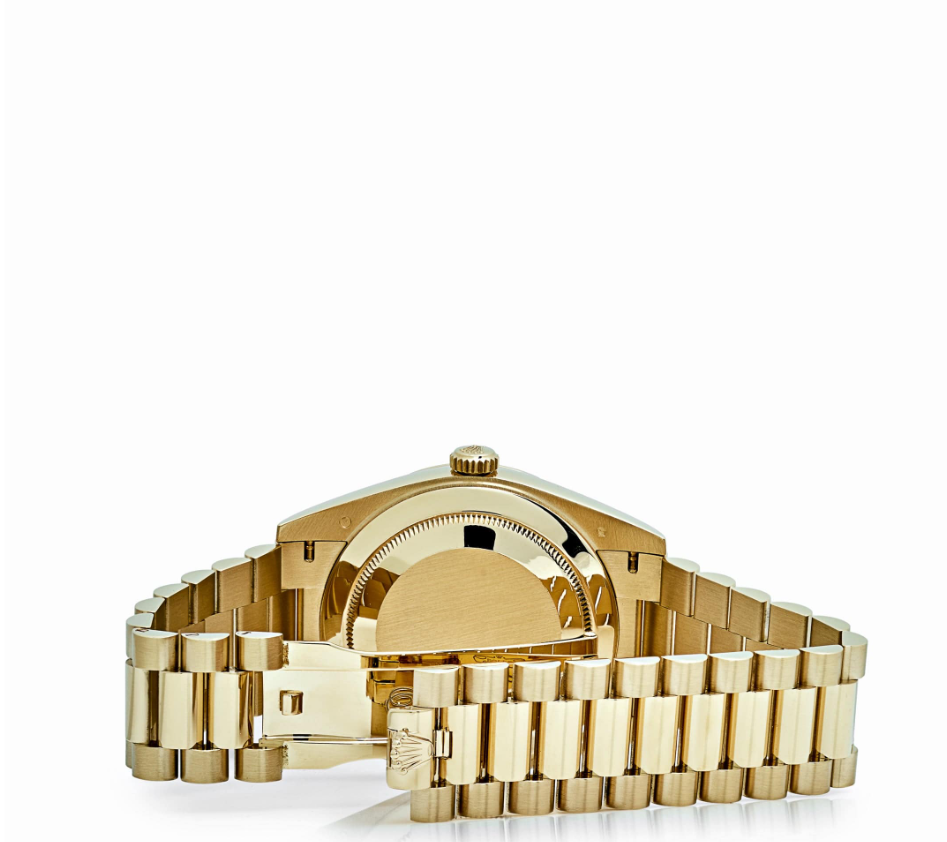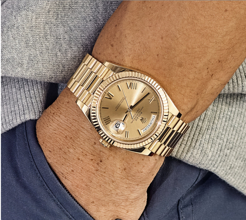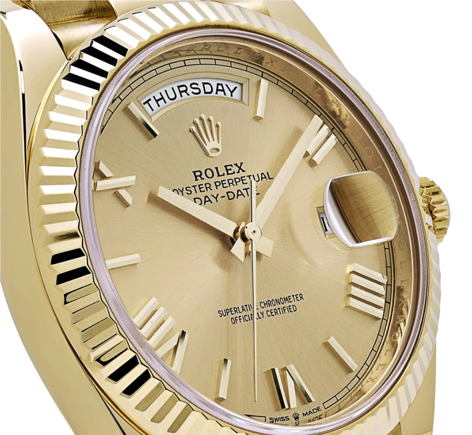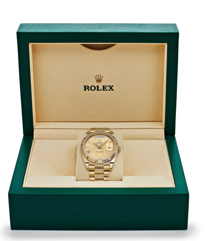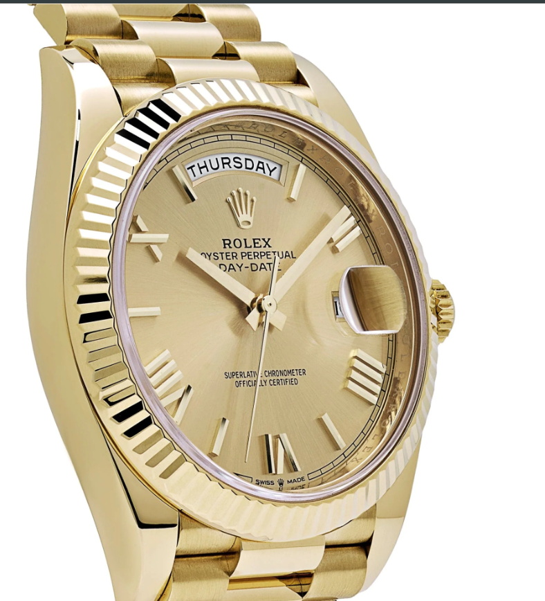 The Rolex Day-Date is a timeless expression of Rolex’s legacy in crafting luxurious timepieces. This model features a 40mm 18k yellow gold case, with a polished fluted bezel, a hallmark of the Day-Date collection that exudes sophistication.