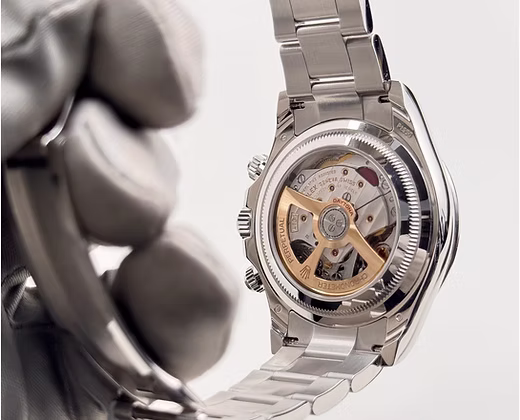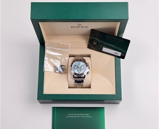The Rolex Daytona 126506 is a luxurious and collectible timepiece, crafted from platinum, the most prestigious material in Rolex’s lineup. Its 40mm case exudes elegance and durability, highlighted by the chestnut brown Cerachrom bezel, which features a tachymeter scale for its motorsport heritage.