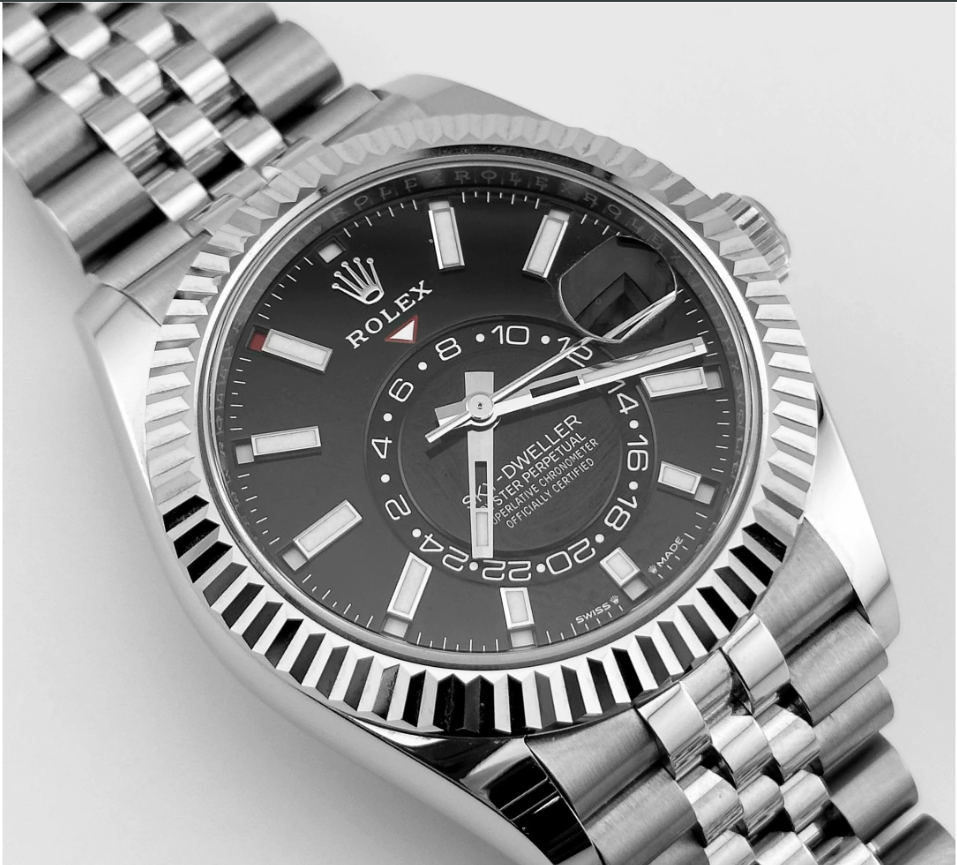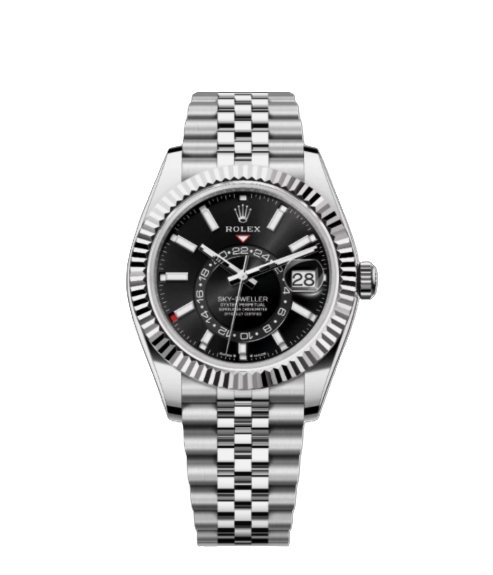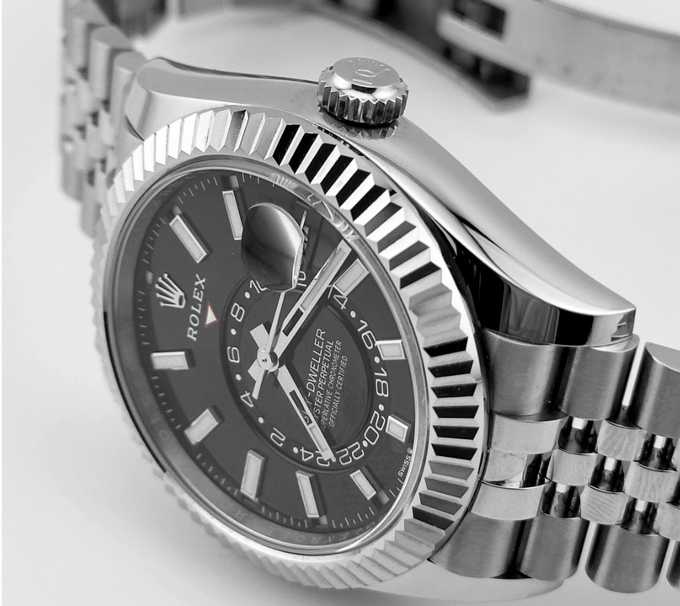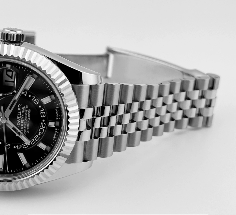 This Rolex Sky-Dweller is designed in a 42mm stainless steel case with a bright black dial and styled on a jubilee bracelet. The dial hosts luminous hour markers and a fixed red triangle that indicates the chosen reference time. A unique Ring Command bezel sets the watch’s features, including a second-time zone and annual calendar capabilities. With 100 meters of water resistance and a catalog of complications, this Rolex Sky-Dweller is ready for any adventure.